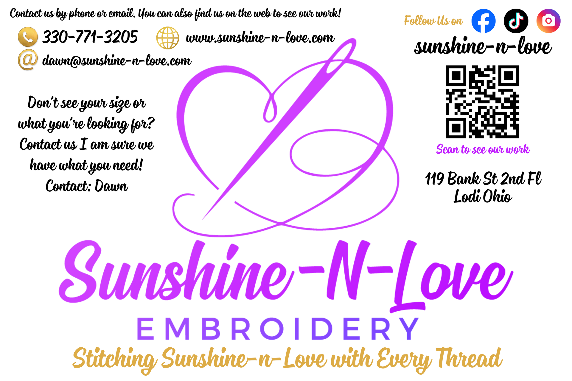 Sunshine-N-Love Embroidery was born from two things I have always loved: crafting and the horse show world. What started as a desire to create beautiful, personalized awards for horse shows quickly blossomed into something so much bigger — a full custom embroidery business right here in the heart of Lodi, Ohio.